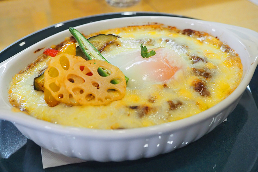 ベースは「牛すじ煮込みのカレーパン」のルー。そこにチーズと温泉玉子、さらにナス、パプリカ、レンコン、オクラが加わり、オーブンでこんがり焼き上げられています。