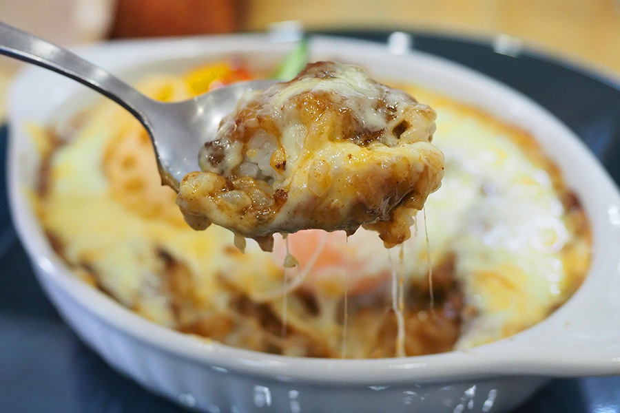 ひと口いくと、濃厚なカレーにとろけたチーズが絡み、あっつあつのライスと一体化。さらに、お皿の端でほんのり香ばしくなった部分がアクセントになっていて――