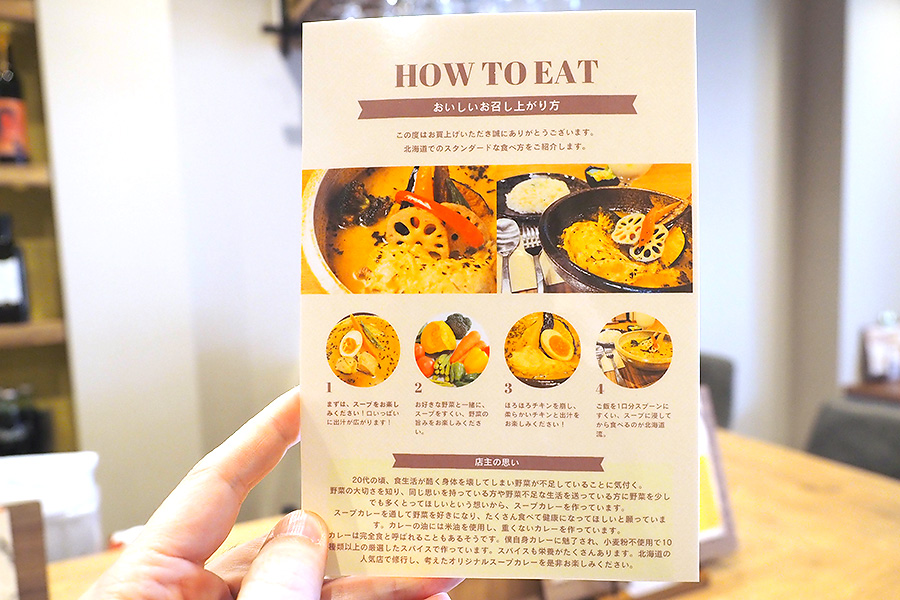席には美味しい食べ方の案内もあるので、気になる方はぜひチェックを。とはいえ、結局は好きに食べるのが一番。この自由さもスープカレーのいいところです。