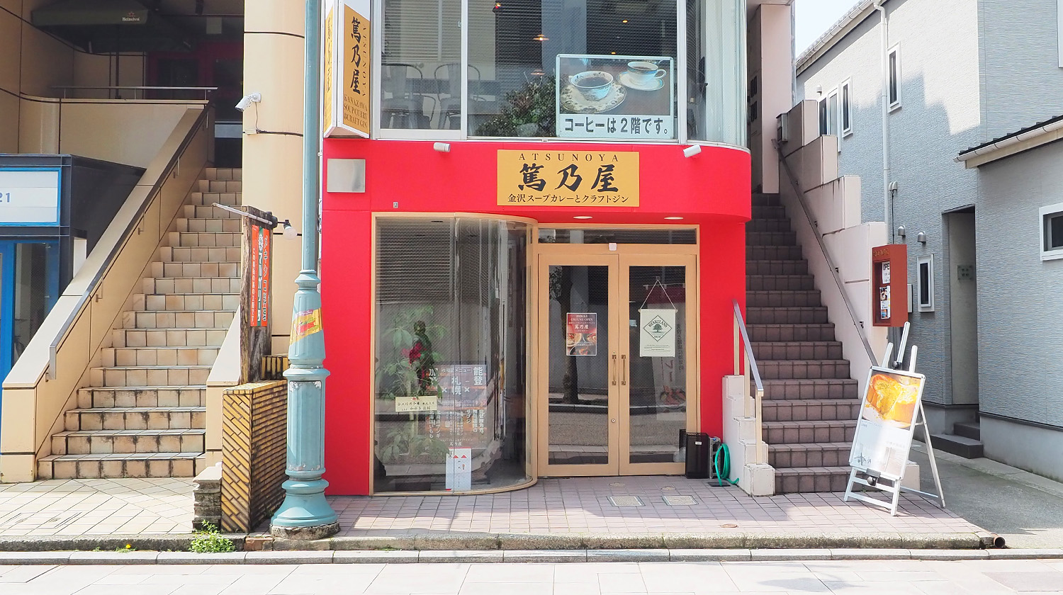 場所は近江町市場にほど近い「名鉄エムザ」裏の通りに入ってすぐ。ざっくりですが、赤い外観なので行けばわかるやつです。街中のため駐車場はありませんが、周辺にコインパーキングがあるので安心。